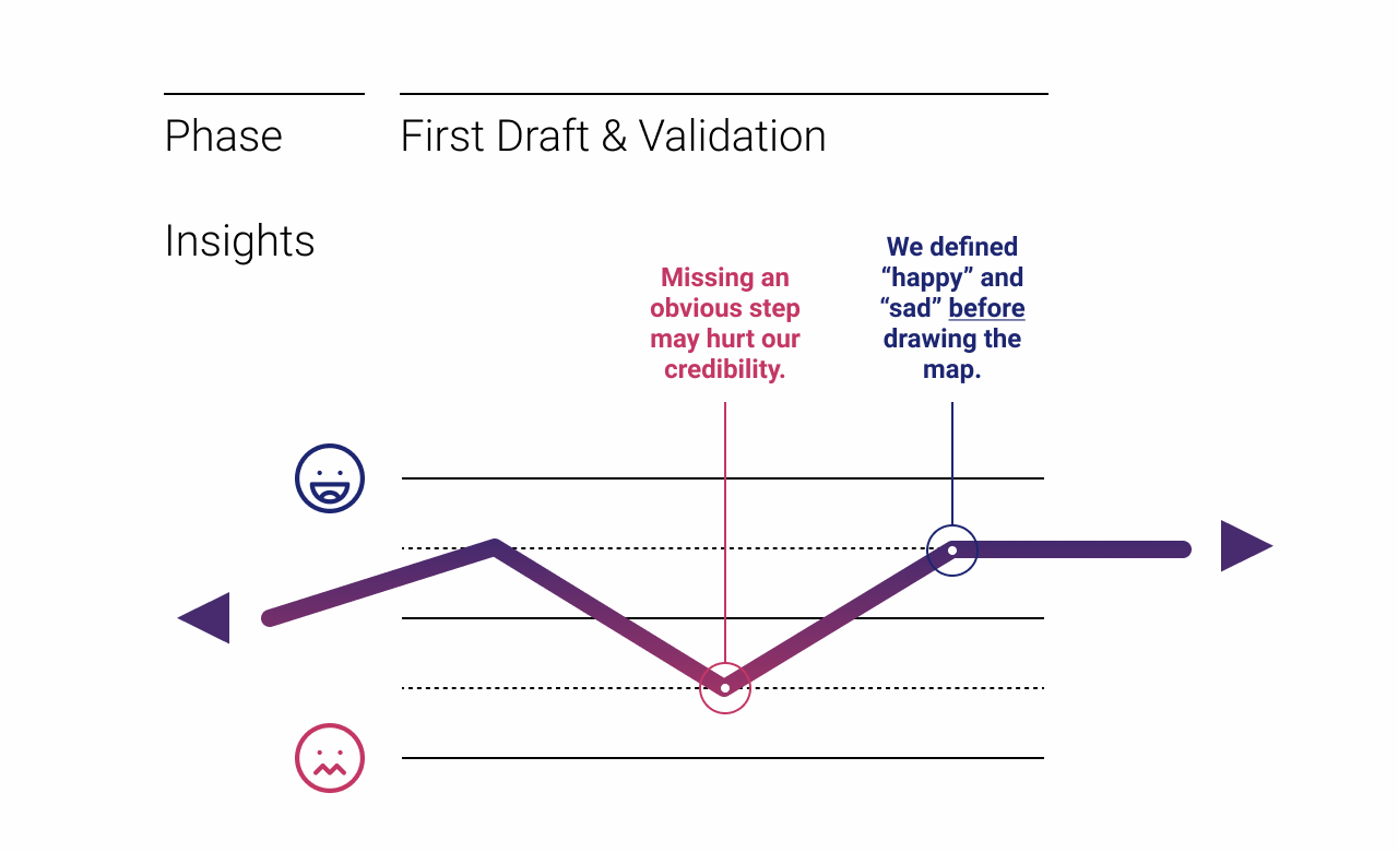 In some cases, we’ll create multiple copies of the same Figma file, so that feedback isn’t “poisoned” by previous comments. This ensures that each set of new eyes sees an unbiased view of the journey map, plus, it also helps us organize feedback by source. For instance, it’s sometimes helpful to see whether journey map feedback from customers matches that from the client, to see what differences may exist.