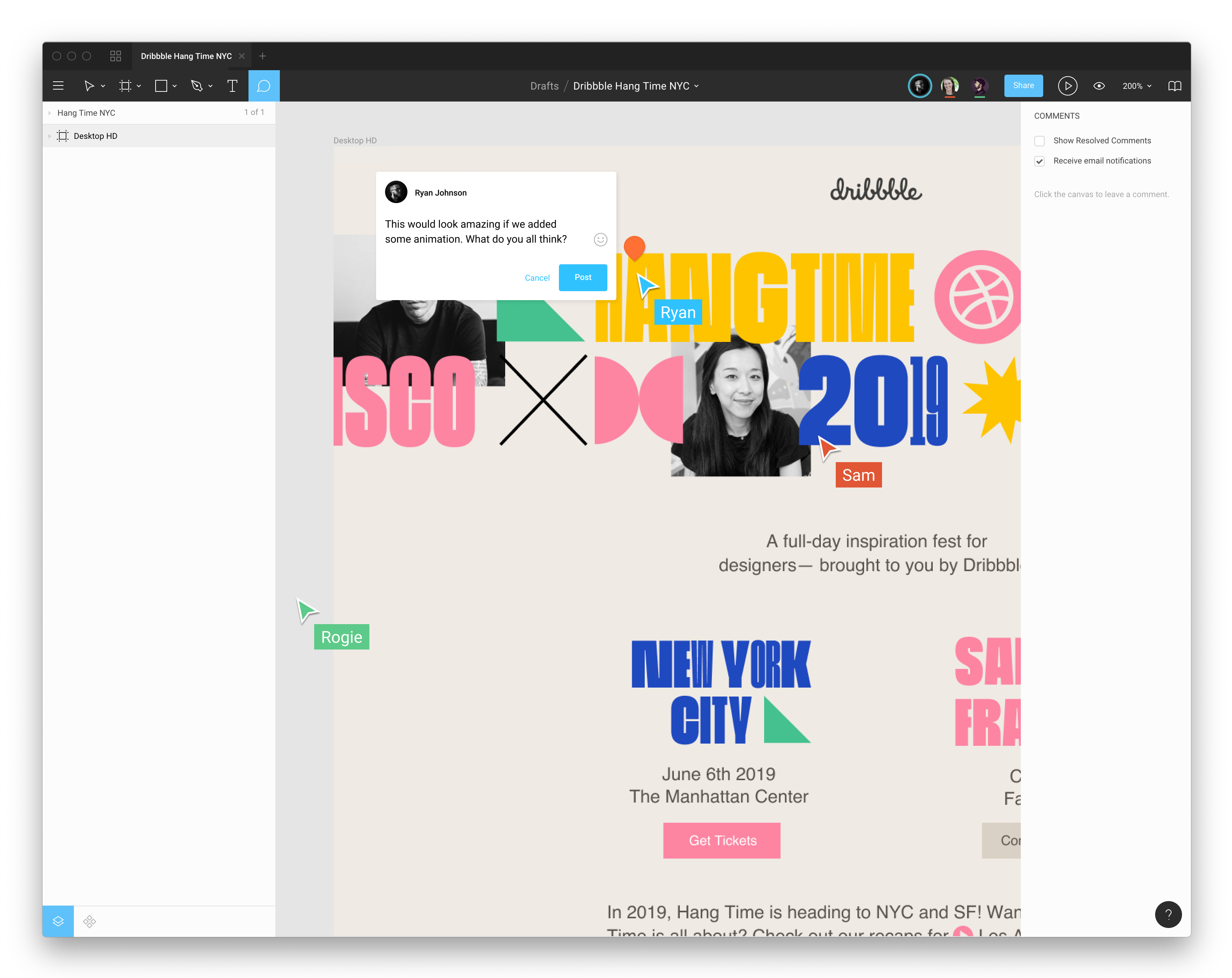 Even the designers that use the Dribbble platform are collaborating and providing suggestions and feedback via Figma to the Dribbble team. “We redesigned the shot page a few months ago and immediately got intense feedback on it,” says Kuehnle. “Our users really care about Dribbble and several invested their own time in creating a Figma file with our new design and iterating on it. We got some great suggestions and actionable feedback from that effort.”