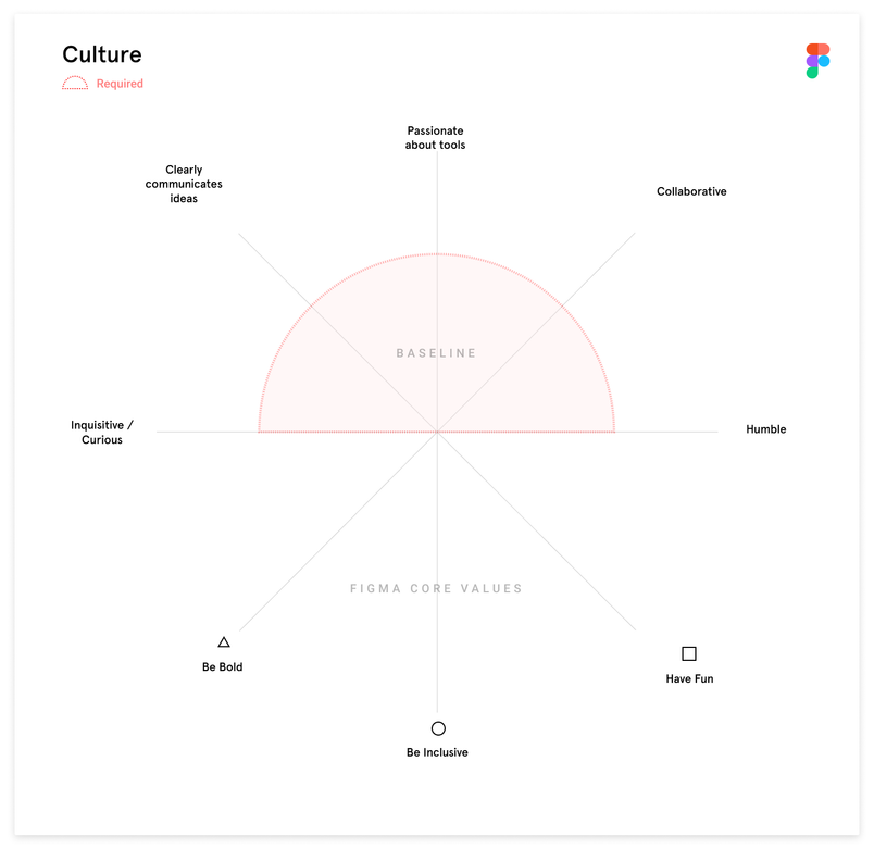 We then ran a similar exercise for cultural components of the interview to make sure we brought on people who would be a good fit for Figma, aligned with the company’s core values (Be Bold, Be Inclusive, Have Fun).