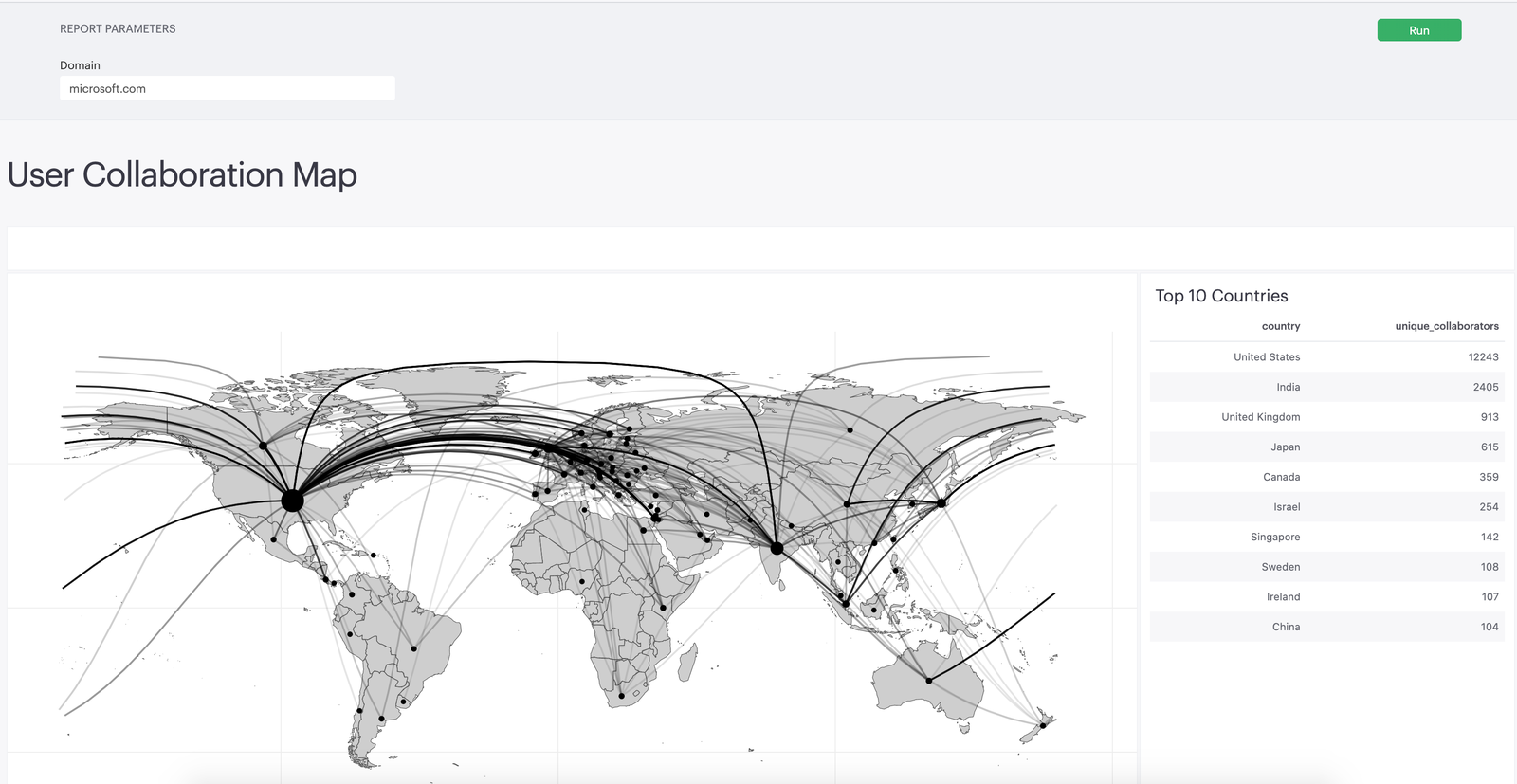 Using Mode, Wendy and Marissa created a map tool that visualizes collaboration between users in different countries—all within a specific domain. This map allows us to better understand how teams at one company work together across regions and time zones.