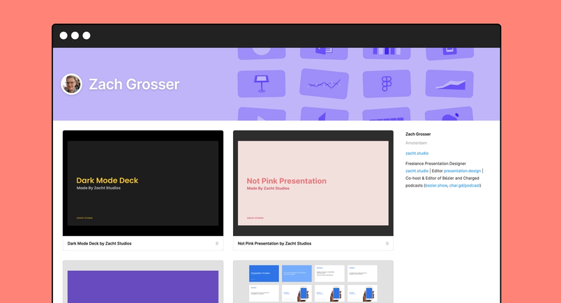 We also spoke with a few independent designers, like David Kulakevich and Zach Grosser, to understand what kind of Figma profile they might create to complement their Dribbble and Behance portfolios. Zach runs his own presentation design business. He’s publishing a few of his most popular slide templates.
