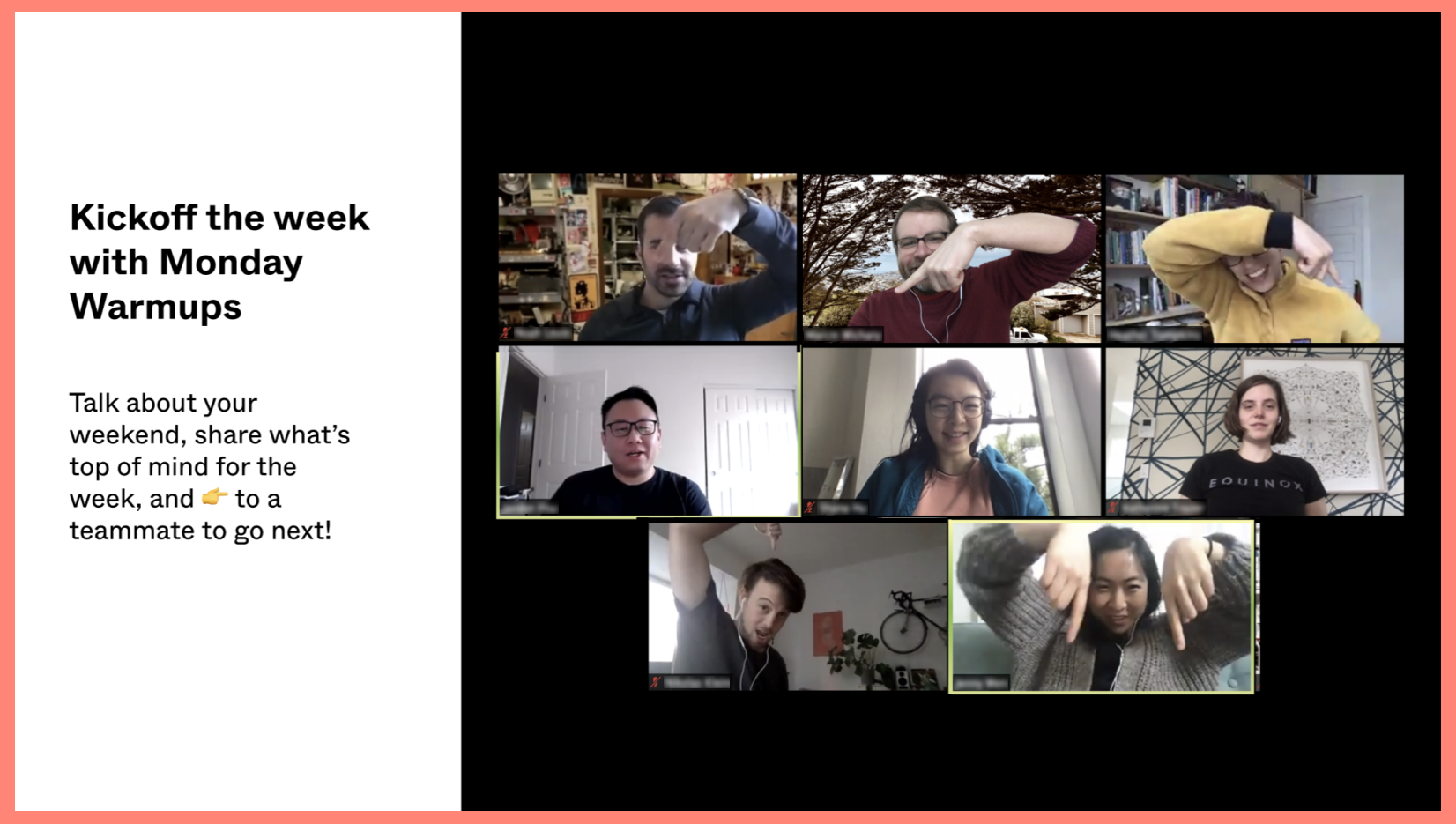 From (optional) team-wide workouts to virtual meetups for dog and cat owners, many of us have been setting aside time to connect with coworkers outside of necessary meetings. We’ve also noticed that making subtle adjustments to routine meetings and communications can make a big difference.