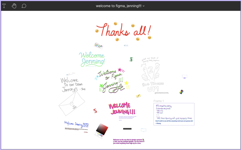 As soon as I started, Figmates flooded my Slack with welcome messages, and my teammates scheduled (virtual) coffee chats for us to get to know each other. Even though the company had grown since that career fair, the culture felt just as open and inviting. Later, my team sent a glorious welcome card—a Figma file filled with warm greetings and doodles. While we weren’t face-to-face, I felt the energy that initially drew me to that booth years ago.