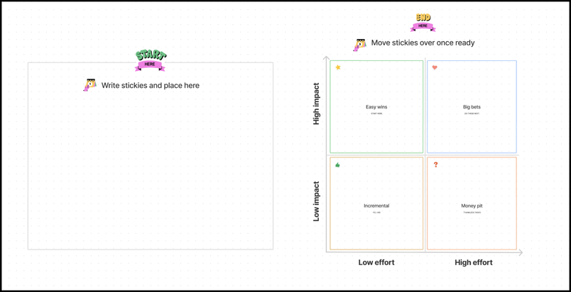 - Assess ideas against outcomes: Evaluate each idea and see how it maps to the north star you created at the beginning of the session. With this Impact vs. Effort template, you can quickly prioritize the most impactful projects.