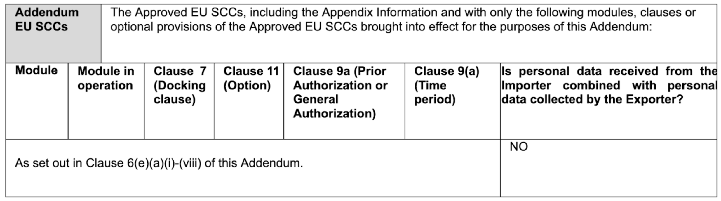 The Appendix Information shall be deemed completed as set out in Clause 6(e)(a)(i)-(viii) of this Addendum.