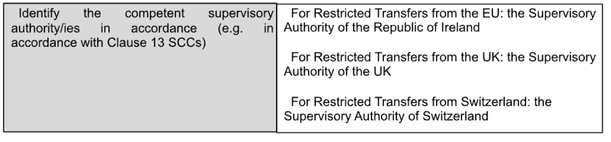 (iv) Clause 13 (a) and Part C of Annex I are not used; the competent supervisory authority is the FDPIC insofar as the transfers are governed by the Swiss Data Processing Addendum;